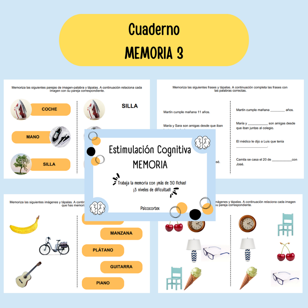 Nuevo cuaderno para estimular la MEMORIA formado por más de 50 fichas de ejercicios.